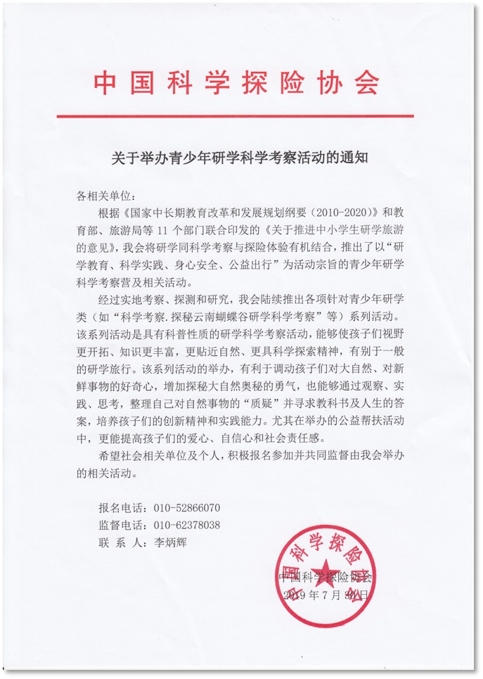 活动宗旨:在科学的引领下,让中小学生在科学考察的研学旅行中,感受祖国大好河山,感受中华传统美德,感受革命光荣历史,感受改革开放伟大成就,增强对坚定“四个自信”的理解与认同;在“与科学家同行”的活动中,从小培养青少年像科学家一样努力学习、探索