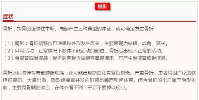 4、正确转运:搬运骨折病人的过程中,动作要轻柔,避免产生骨折端的错位或移动;对于脊柱骨折的病人,搬运中一定多人协调,保持脊柱的轴向稳定,否则容易引起脊柱错位,损伤脊髓导致瘫痪。颈椎骨折的病人,搬运过程一定要专人负责头部和颈椎,保持和躯干平行的体位,否则容易导致四肢瘫痪甚至死亡。