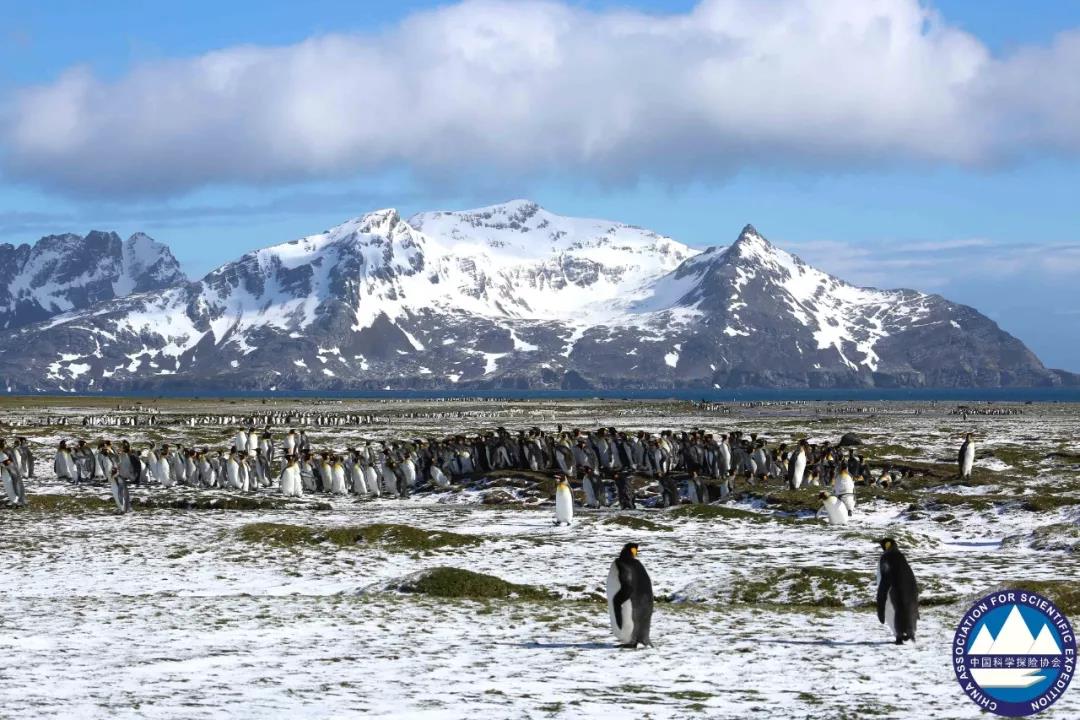 海湾四周有雪山包围,岛上栖息有金图企鹅和其他鸟类。