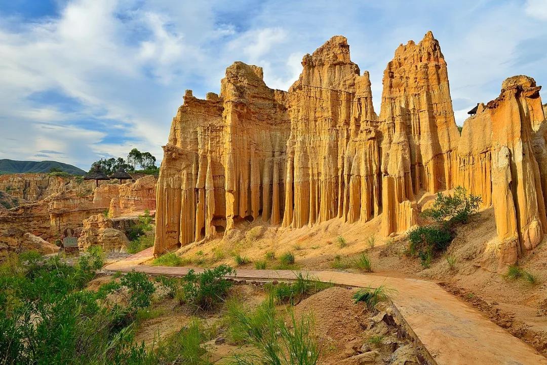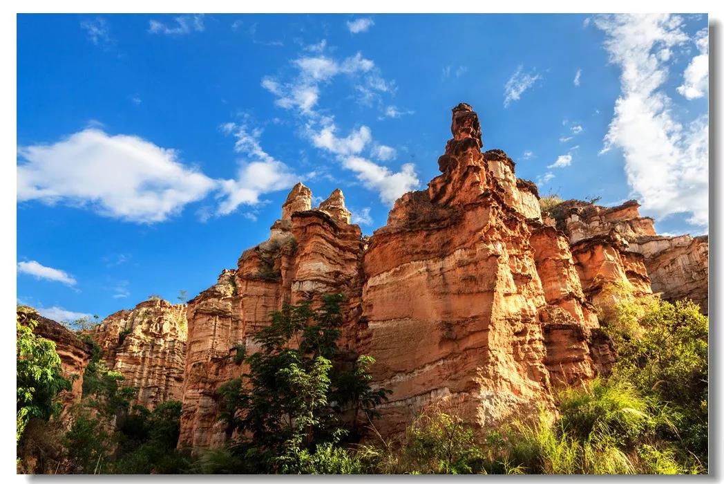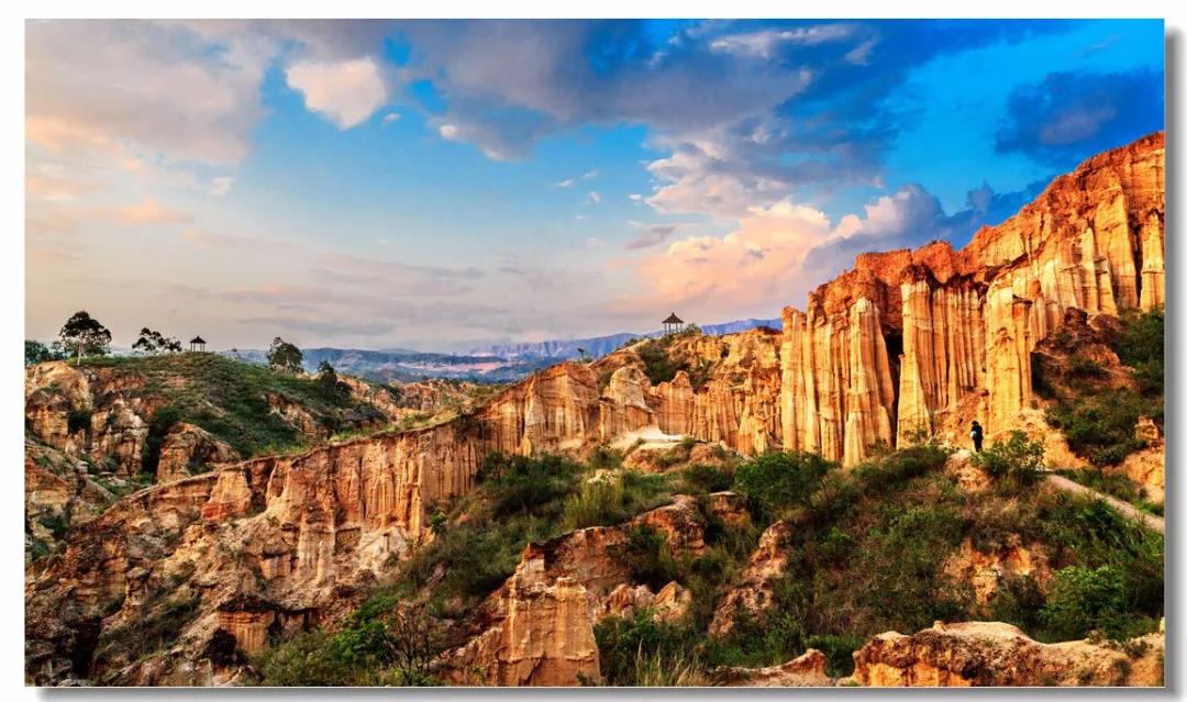 地质工作者们发现,在这些千奇百状的峰林周围,都是富含石膏膏盐的岩层,峰体均发育于这些膏盐岩层。这些含有石膏膏盐的页岩泥岩,经雨水沿垂直裂隙淋蚀而形成峰丛。从平缓的斜坡望上去,这些峰丛高约百余米,层层叠叠,错落有致,柱体造型多变,形态逼真,有的象扬蹄奔腾的骏马,有的象亭亭玉立的少女,有的象直刺苍穹的利剑,宛如一尊尊天然浑成、妙趣横生的石膏造像;由于原岩物质成分的差异,历经千年的日晒雨淋,层峦尽染,有的灰绿,有的灰紫,有的灰红,有的黄褐,构成一幅幅色彩变幻多姿、色调柔和协调、蕴含浓郁诗情画意的彩墨画。驻足流连,不禁要惊叹大自然造物的鬼斧神工。