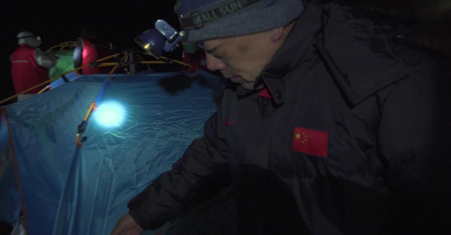 在零下21.5°C的夜晚,科考队员全体出发,22:30抵达乌兰哈达火山5号火山脚下进行雪地露营。
